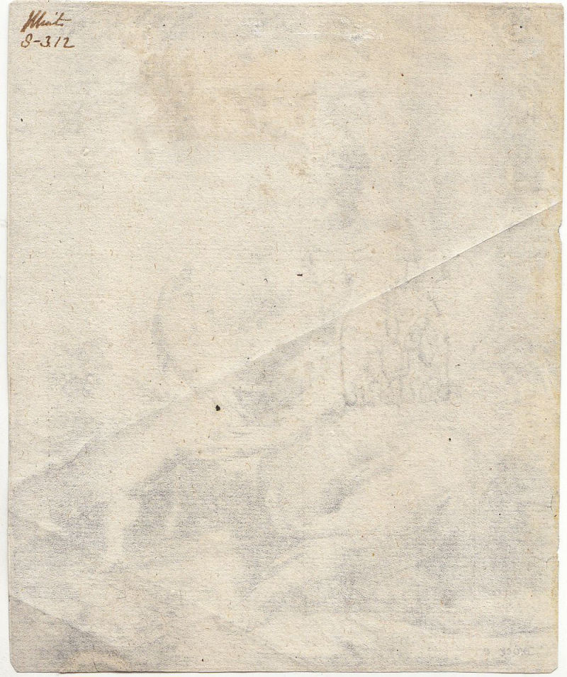 Ca. 14,7 x 12,2 cm. Bis an den Rand der Darstellung beschnitten, Knickspur schräg durch das Blatt, verso mit Sammlervermerk von alter Hand in Tinte.
